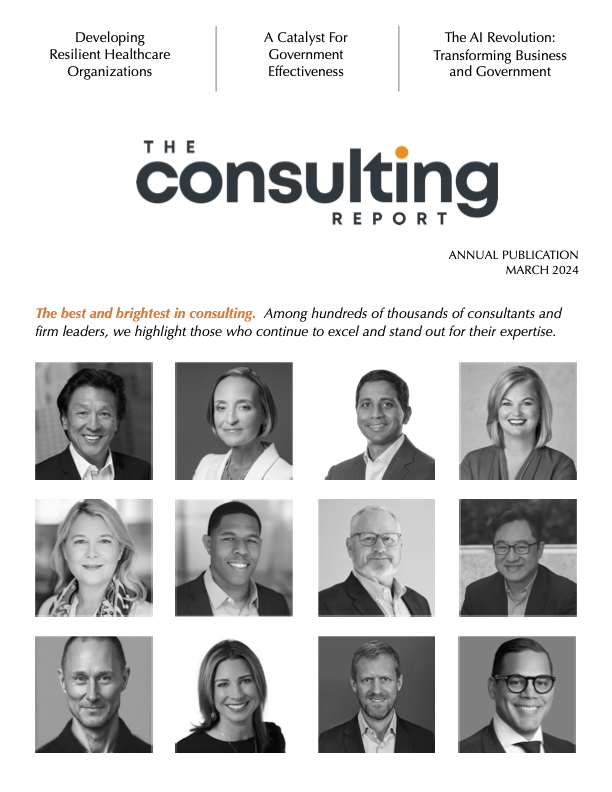 The Consulting Report is pleased to announce its 2024 Annual Publication, which features the top consulting firms, consultants and firm leaders. The publication also covers important trends in technology, healthcare and government. Access the publication here.
